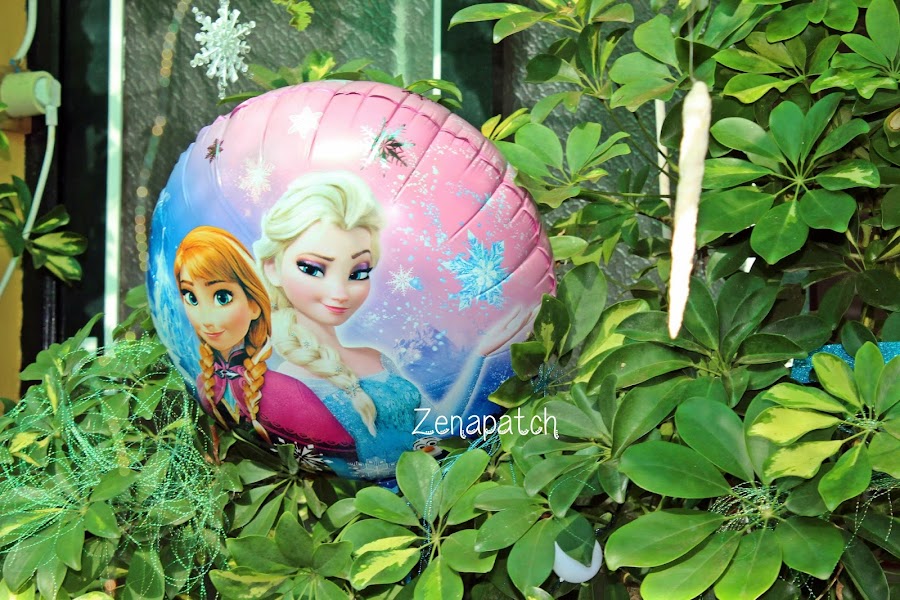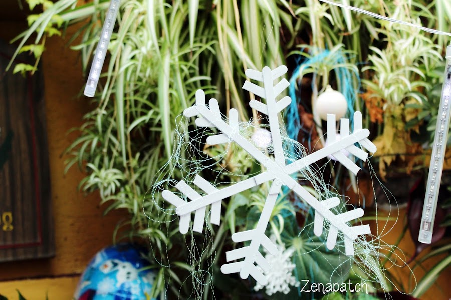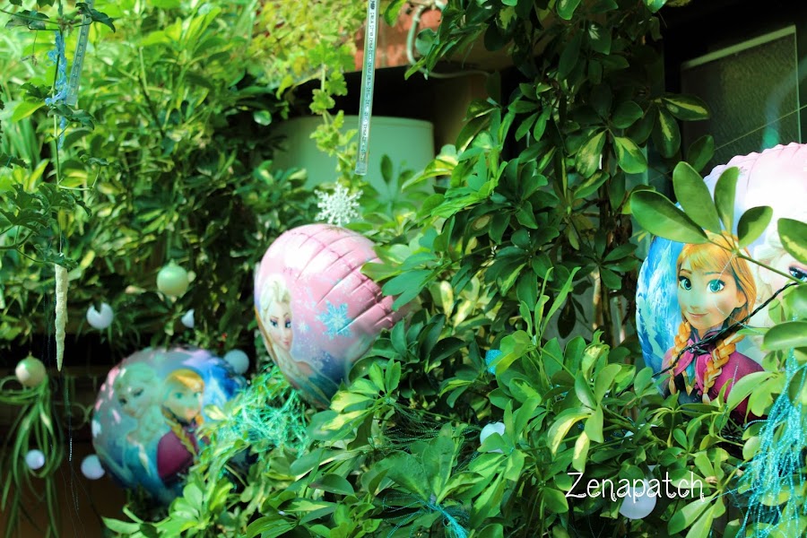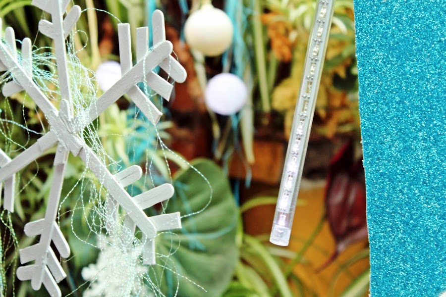 8.- Utiliza adornos navideños! Si tienes algún adorno navideño en blanco o azul, úsalo, dará un toque especial a la fiesta. Nosotros pusimos las luces de navidad donde tenemos las plantas, para darle algo de vidilla al rincón, y cuando anocheció se veía preciooooso!! En especial unas luces que hacen el efecto de que cae nieve, genial! Pero también puedes utilizar bolas, hilitos, estalactitas o lo que tengas.