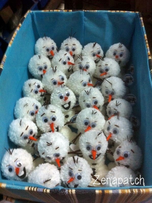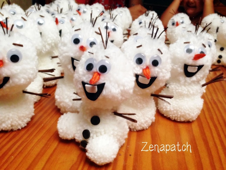 Uno a uno, cada uno tenía 5 pompones de lana (cabeza, pecho, barriga y dos patas), los brazos, palitos, también cortados uno a uno y el interior de los "dedos" pintados, para que no se viera la madera por dentro, las cejas y el pelo también son palitos de madera, la nariz cordón naranja, los ojos pegados uno a uno, y la boca y los botones hechos con goma eva... ¿¿Es una artista o no es una artista??