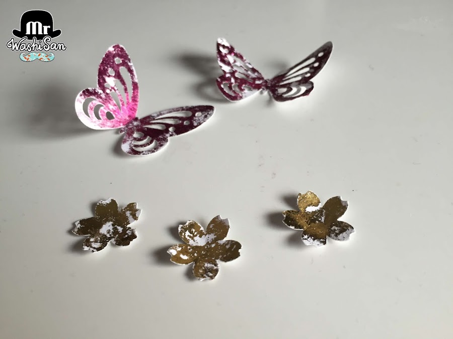 7. Si ponemos adhesivo en barra sobre una figura troquelada, podemos aplicarle foil ya utilizado, quedando adherido de manera irregular con aspecto muy vintage.