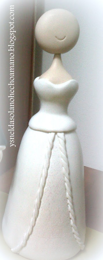 2. El dorso de la novia se realiza sólo con pasta moldeable (sin base de telgopor) a partir de un rollo de masa, ahuecando en la parte inferior para posteriormente encajarlo en el cono previamente forrado.