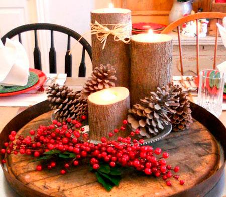 Centro de navidad con troncos, piñas silvestres y rusco.