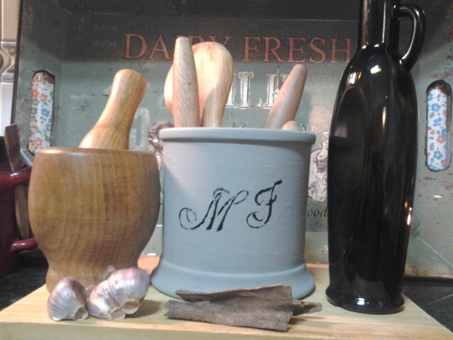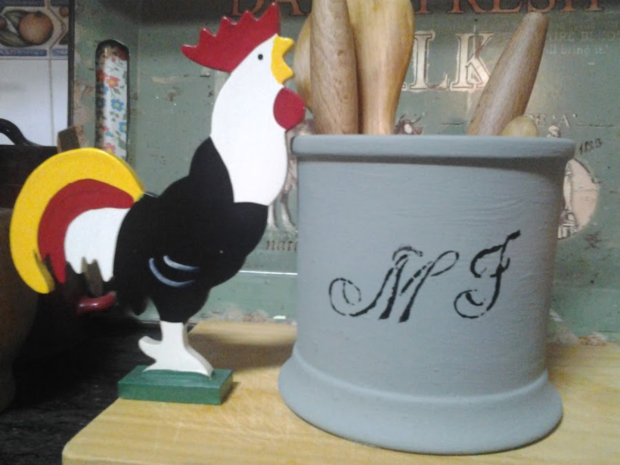 Ahora lo utilizaré para dejar los cucharones de madera, aqui está acompañado del gallo que me traje de Portugal.