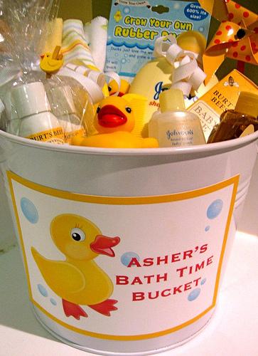 Si no eres manitas o te toman las prisas preparar esta cubeta para el baño será un bonito y estupendo regalo, quizá el detalle del patito de goma sea lo que le de ese toque ternura tan bonito para el nuevo bebe.