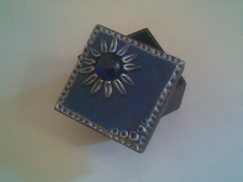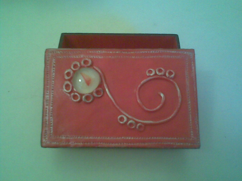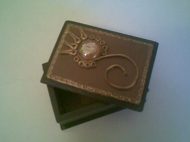 Aquí les muestro unas cajas de madera a las cuales forre sus tapas en porcelana fría, les aplique una gema de vidrio y realice detalles en la misma porcelana (arabescos, círculos, gotas)