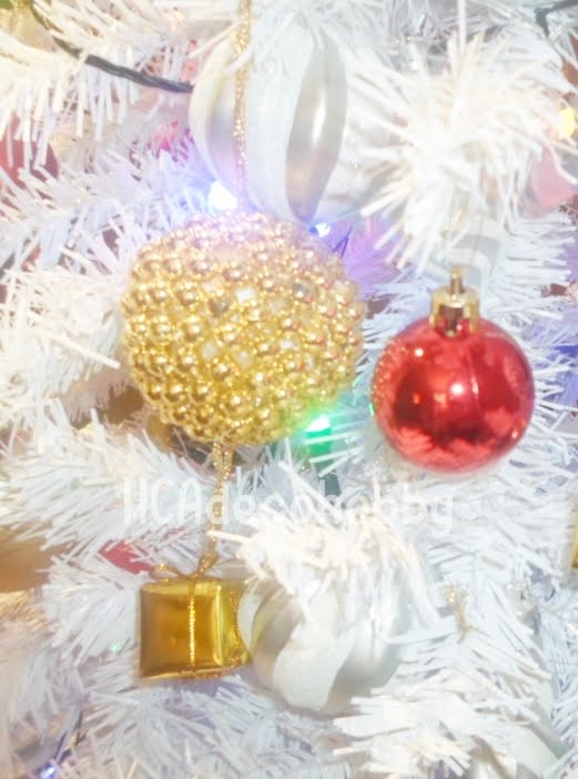 La primera idea que te voy a compartir, es una esfera con perlas doradas preciosa con un toque de elegancia y mucho color para tu árbol.