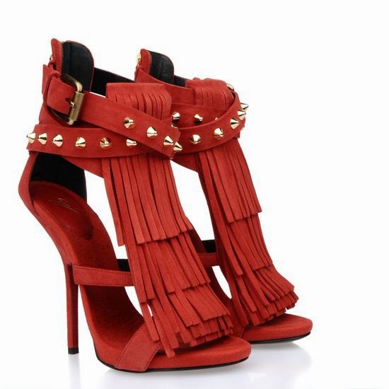 Están de moda también las tachuelas y los flecos , el diseñador Giuseppe Zanotti tiene unos zapatos de la colección African Queen de flecos y tachuelas (me enamorado de ellos, me encantan pero no los miraré mucho porque no puedo je je) al increible precio de 900 ? guau menos de la nomina de un mileurista que injusticia, bueno cambio de tema y vamos a ser positivos.