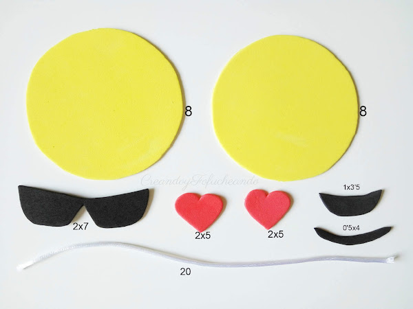 Una vez tengamos recortadas las 7 piezas,hoy de tamaño razonable,jajaja, pegamos con silicona o el pegamento que tengamos pa la goma eva,los corazones y las gafas en la parte de arriba,y las bocas respectivas,en la parte baja de las piezas amarillas.