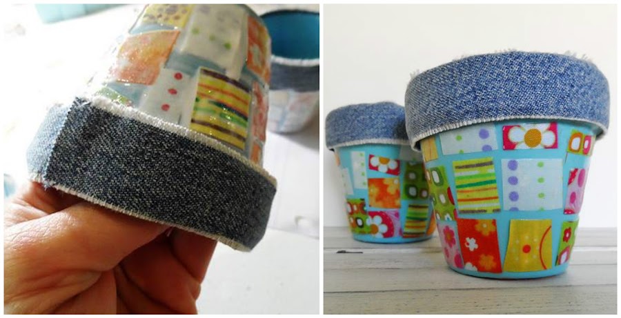 2.-Recicla tus jeans , y corta tiras anchas para pegarlas en el borde superior de la maceta.