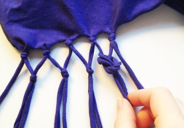 4.-Ahora viene lo divertido, agrupa los flecos de 2 en dos y haz nudos a lo largo.