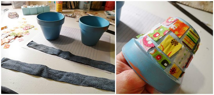 3.-Pon un pincel, pon pegamento blanco en toda la maceta y pega retazos de tela de diferentes tamaños.Una vez que tengas todo bien pegadito, pon una capa de pegamento blanco diluido en agua.