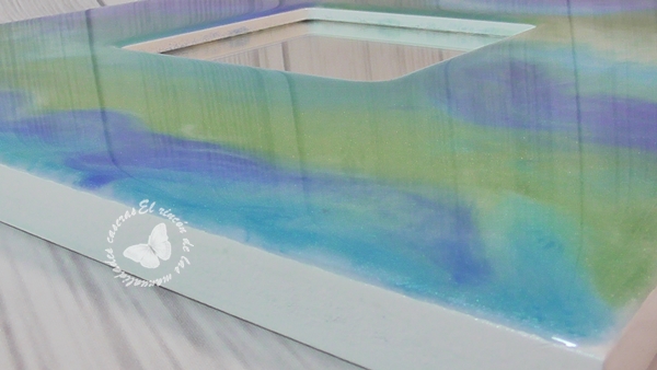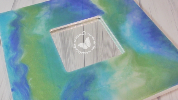Con el marco he utilizado la técnica del pouring, consiste en verter pintura sobre la superficie que quieres pintar sin necesidad de pinceles o espátulas e inclinando despacio y con cuidado la base que utilizamos mover la pintura, mezclarla y crear dibujos muy interesantes, es aconsejable utilizar un mínimo de tres colores. Con la resina además de crear dibujos preciosos tiene un acabado brillante, muy similar al cristal y de una gran dureza.