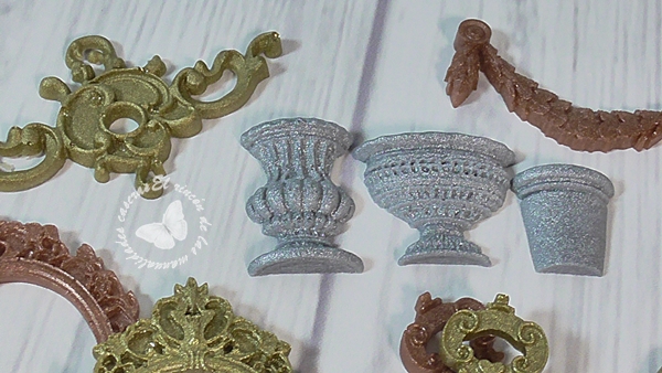El marco lo he hecho con los pigmentos Sahara, con base mica y el acabado es nacarado y las piezas más pequeñas he utilizado unos pigmentos metálicos color oro, cobre y aluminio.