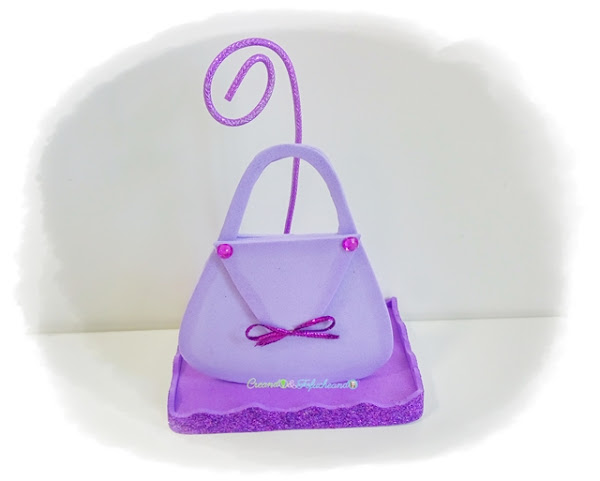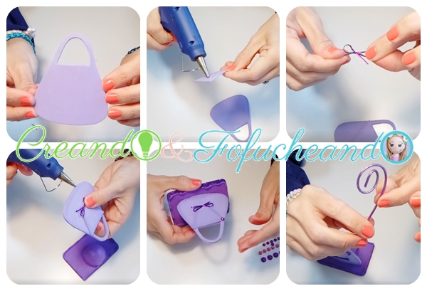 Colocaremos el bolsito apoyado en la bolita y a éste le podemos añadir unos detallitos fashions como son un pequeño lacito que podemos hacer con una cinta fina y … eso es! morada,jajaja, y también le añadiremos pegatinas de perlitas que siempre dan un toque elegante a las manualidades.