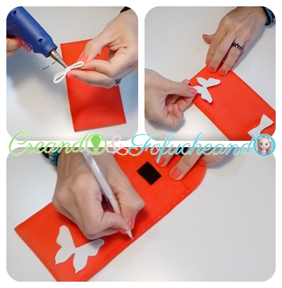 En la solapa colocaremos nuestro velcro a modo de cierre, y pegaremos esa gente que te comenté antes, jajaja, es decir: el lacito en el cierre y la mariposilla que se ha posado feliz en la parte baja.