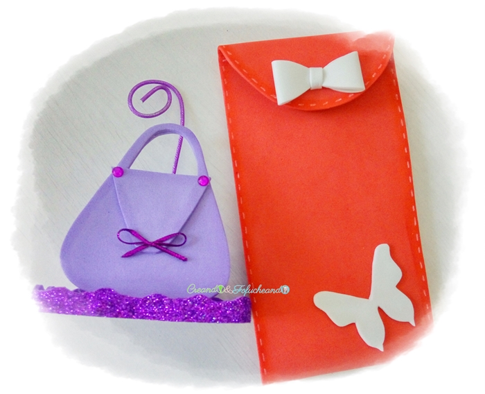 Colocaremos el bolsito apoyado en la bolita y a éste le podemos añadir unos detallitos fashions como son un pequeño lacito que podemos hacer con una cinta fina y … eso es! morada,jajaja, y también le añadiremos pegatinas de perlitas que siempre dan un toque elegante a las manualidades.