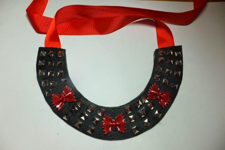 Este año estan muy de moda los Collares babero , este de lo más original que lleva cuero, tachuela y lacitos de pasta pintados nos lo trae Decorate tu misma.