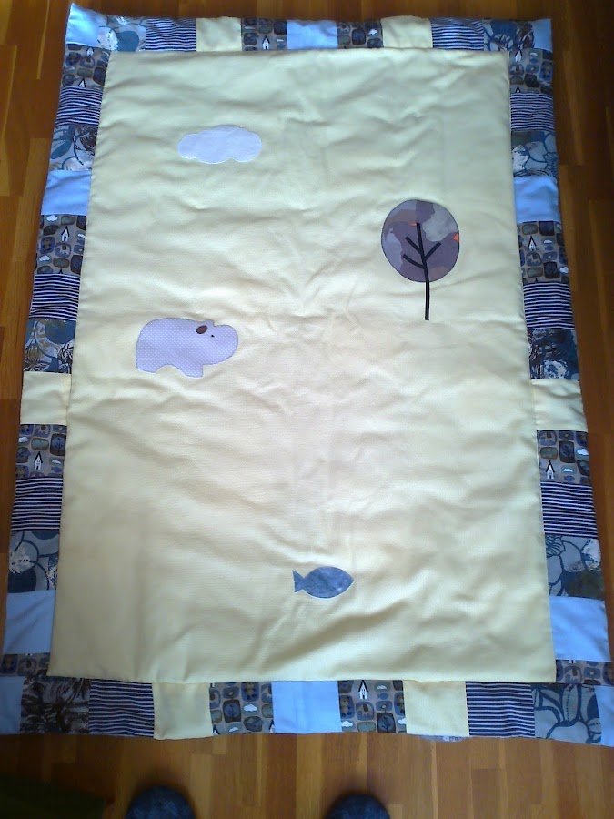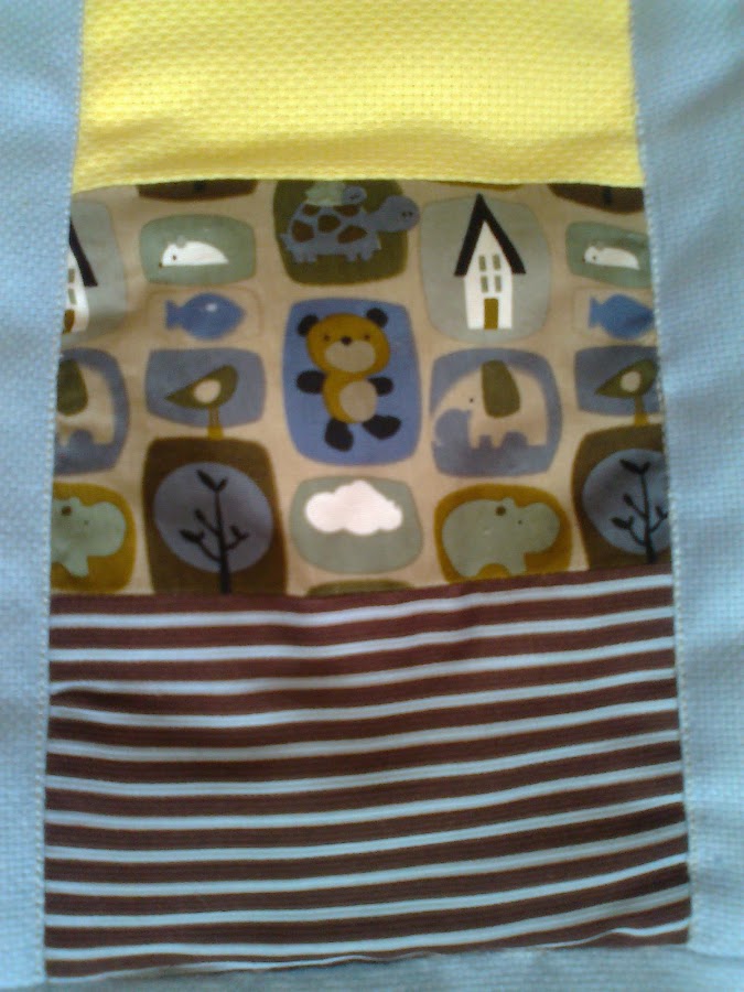 El reverso en principio debia ser todo liso en panamá amarillo, para el de tiras azules y en panamá azul para el de tiras amarillas, pero al faltarnos tela, decidimos ponerle el marco con todas las distintas telas que nos habían quedado.