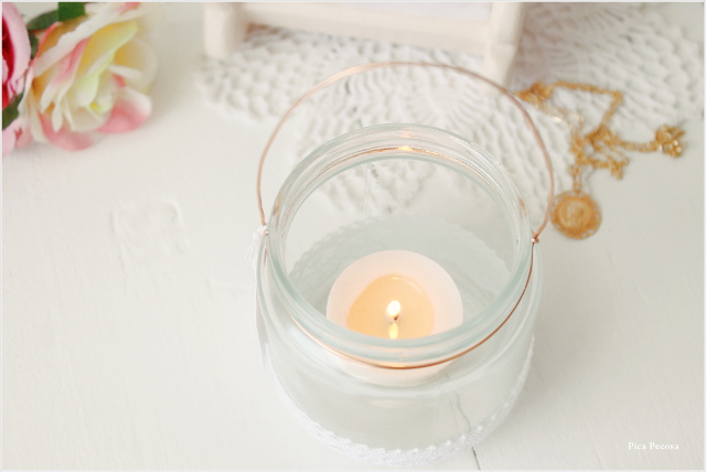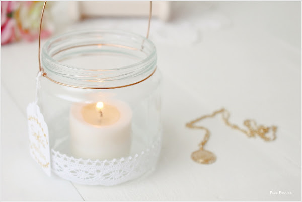 Lo hice siguiendo el tutorial de la planta metida en un bote que #laniña dio por su cumpleaños a los compis de clase (aquí), aunque cambié el alambre del asa por aluminio dorado (descubrí que es muy blando, con la parte buena de que lo cortas dando vueltas sobre sí mismo y la mala de que si lo manipulas demasiado acaba rompiendo por donde no quieres) y el washi tape por puntilla: