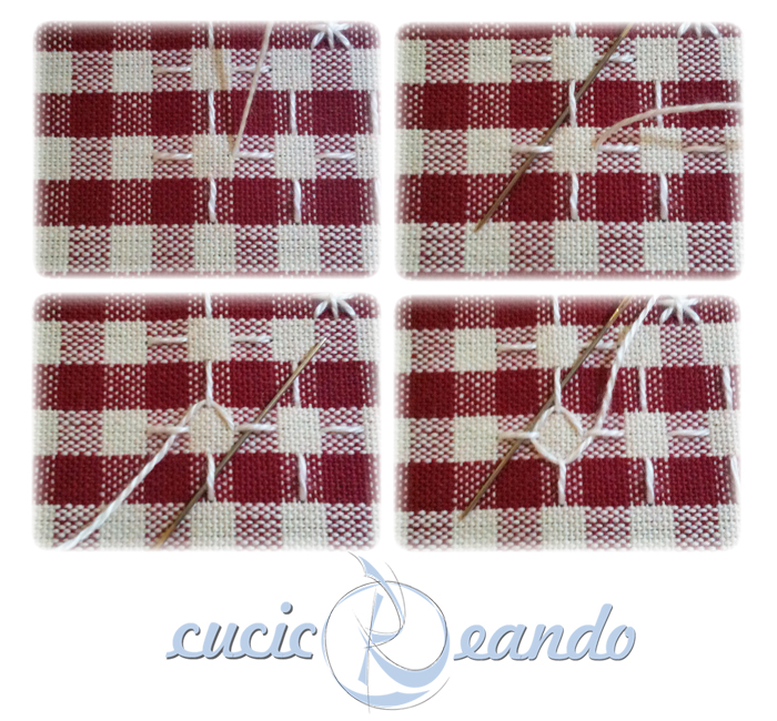 Torniamo sul rovescio del lavoro puntando l"ago vicino alla barretta da cui siamo partite e ripetiamo lo stesso procedimento per tutte le barrette che abbiamo fatto in precedenza così da ottenere questo risultato.