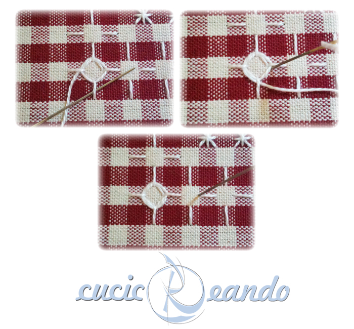 Adesso andiamo a creare i nostri cerchietti. Dal rovescio usciamo sul dritto del lavoro vicino a una delle barrette, passiamo con l"ago una prima volta sotto tutte e quattro le barrette....e poi una seconda volte sotto tre barrette...