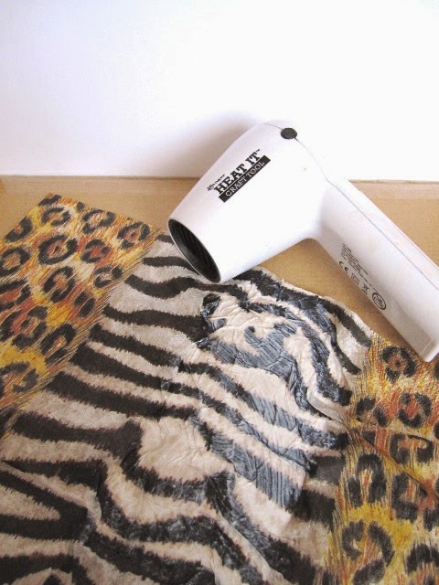 Una capa de Medium Decoupage, la capa estampada de la servilleta, arrugar un poco la servilleta, otra capa de Medium Decoupage y a darle un ratito con el secador de emboss de Ranger. Eso, o esperar a que se seque por sí solo.