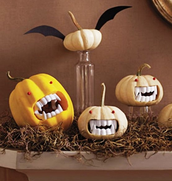 También puedes cortar una calabaza y ponerle unos divertidos dientes de drácula que en estas fechas los consigues en cualquier dulcería o super mercado.