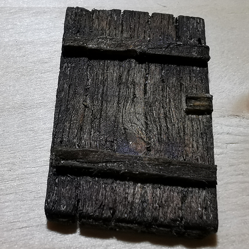 La puerta 3 es de palos de helado, he usado y pegado tres palos que tenia manchados de remover pintura verde, después he sacado textura con un cúter y le he pegado las traviesas,
