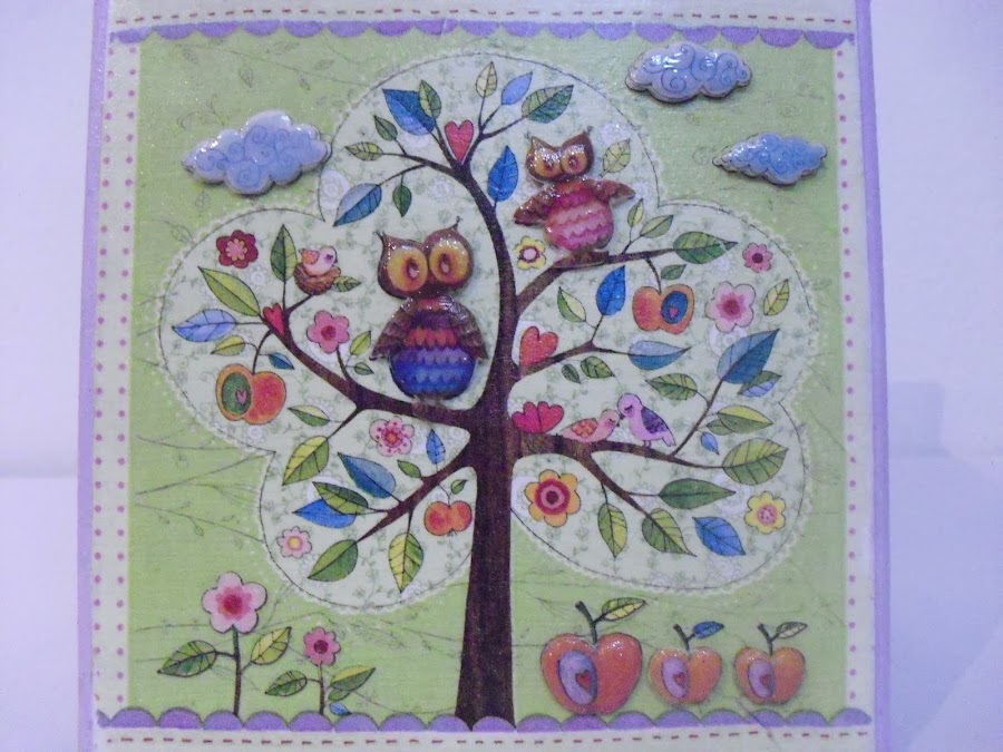 En esta foto los detalles del decoupage en 3D (nubes. búhos y manzanas) en relieve en porcelana fría y dimensional
