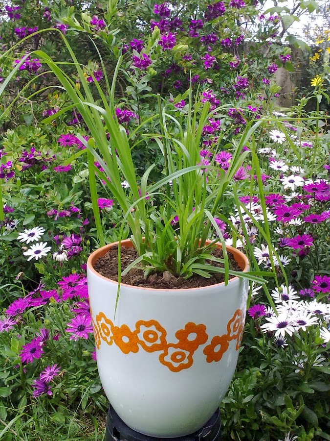 como todos los años trato de aportar una nueva maceta en este día de celebración, este año reutilicé una que tenía hace años guardada y le puse un Cyperus alternifolius (planta paraguas)