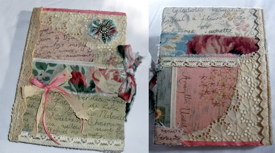 Estas son las tapas del diario en un estilo shabby chic a las cuales forre con telas rasgadas, puntillas (teñidas con té) y le aplique un moño y un rocentón de tela con detalles de estrás antiguo.