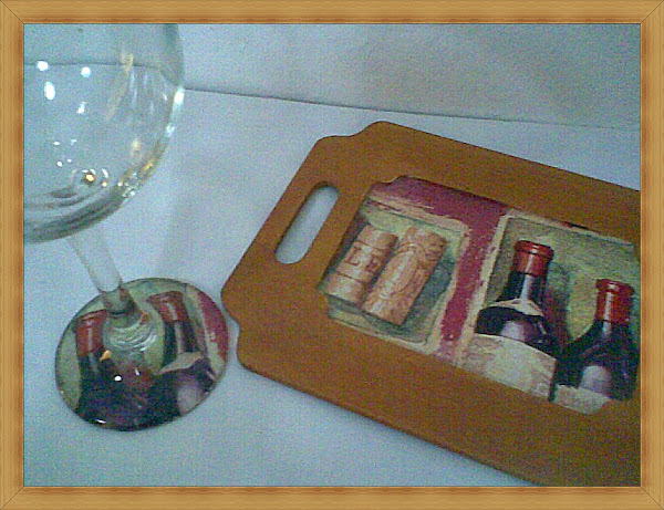 Aquí un Set de bandeja y copa decorados en decoupage sobre madera y vidrio con una imagen (servilleta) de botellas de vino y corchos.