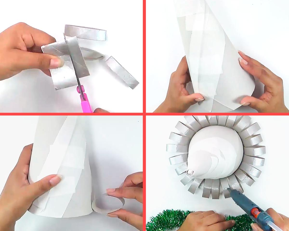 Repite una fila de tiras de tubos de cartón y una de guirnalda hasta cubrir el cono, agrega la estrella y listo!