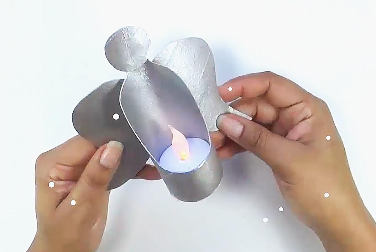 Finalmente añade la vela artificial, y tendrás un lindo candelabro en forma de ángel.