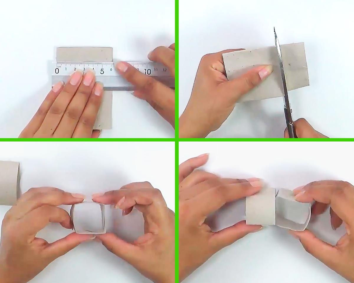Toma la medida del ancho del tubo de cartón que tengas, y toma la mitad de esa medida para cortar el tubo.