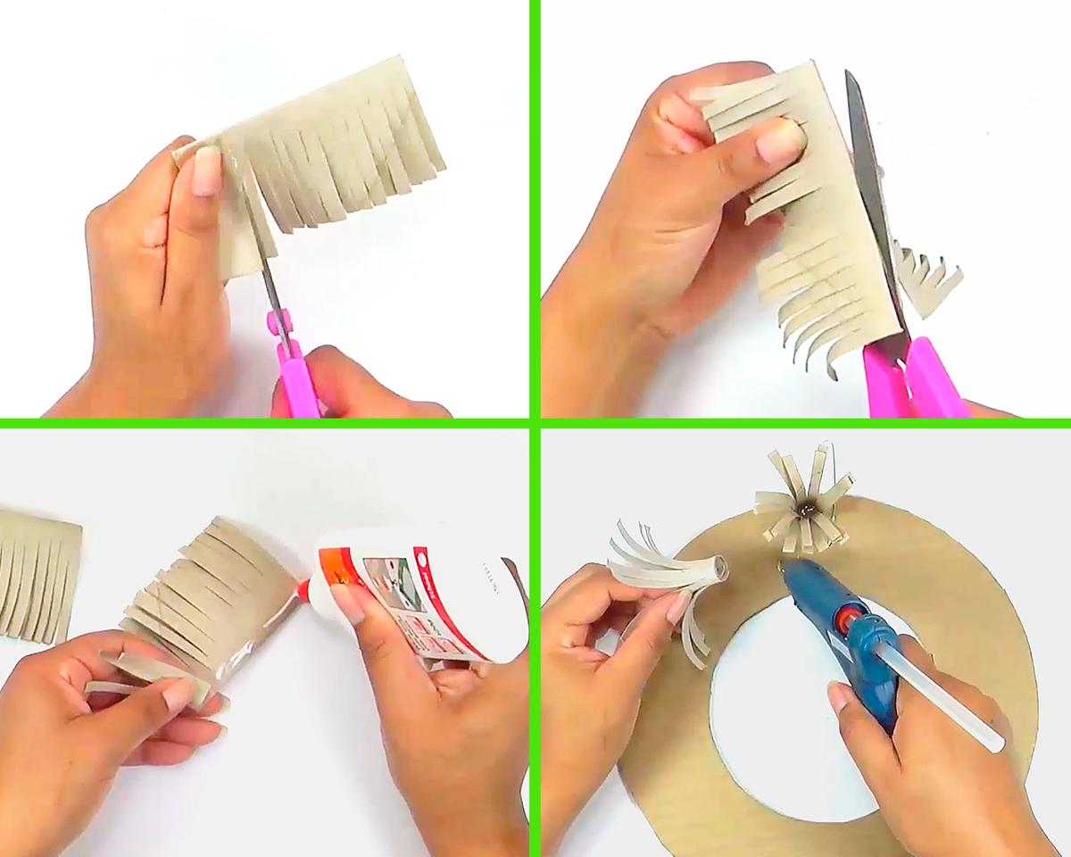 Aplasta los tubos de cartón y haz cortes cada 1/2 cm sin llegar a cortarlos del todo.