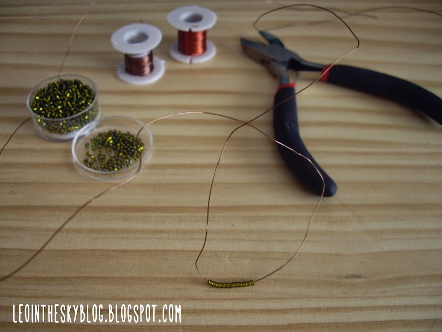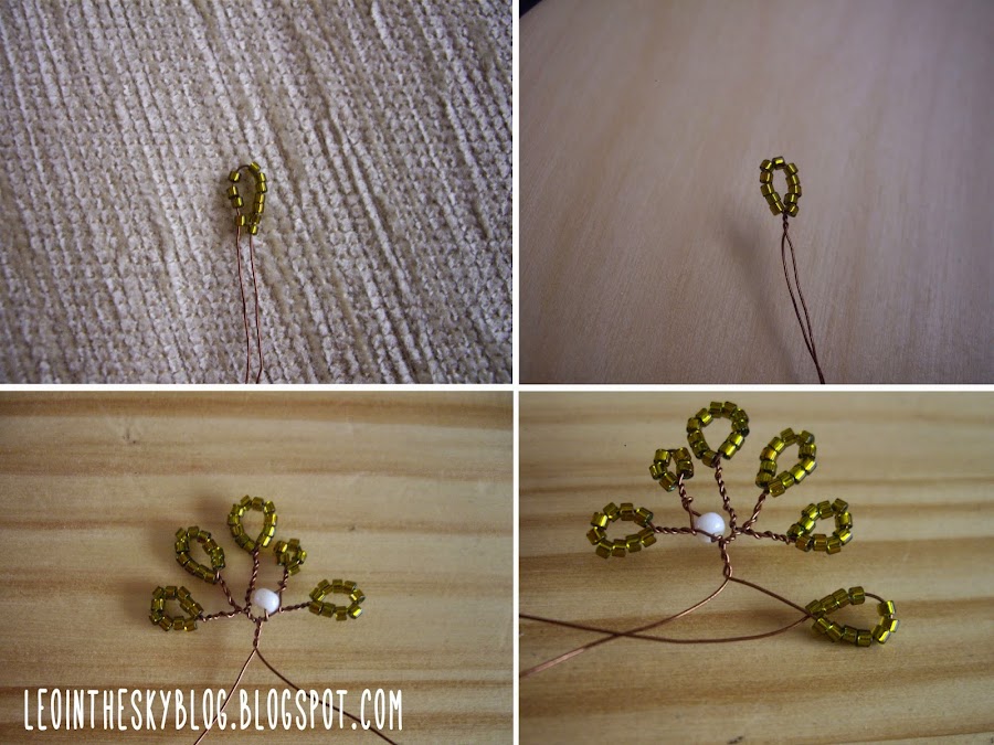 Para hacerlo fui ensartando los abalorios dorados en el hilo de alambre, siempre en número impar, para las hojas grandes puse 11 y para las pequeñas 5 y de vez en cuando metía alguna cuenta blanca.