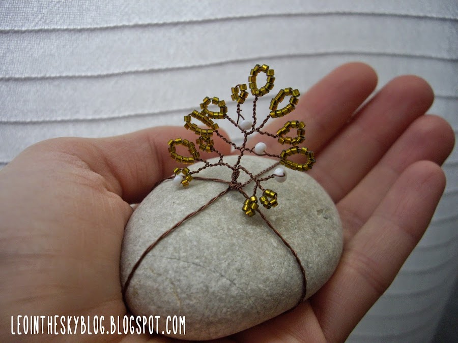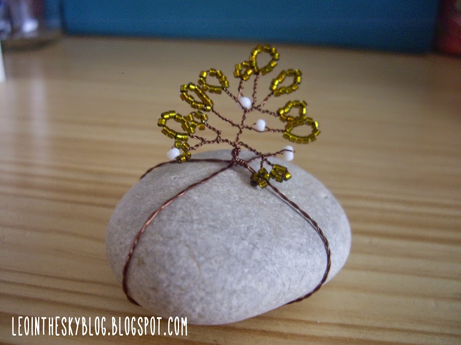Y después de hacerlo, me sobrevino la duda...¿y ahora para qué lo puedo utilizar? pues se me ocurre que se podría usar para hacer un broche, un colgante..., seguro que quedarían genial varios arbolitos de distintos tamaños enrollados en una peineta para hacer un adorno para el pelo (esta idea me la guardo para futuros estilismos en bodas y comuniones venideras), como adorno para un regalo... o puedes hacer lo que hice yo, que fue atar el arbolito a una de las piedras que expolié de una playa hace unos años y dejarlo como simple elemento decorativo..., y si haces varios arbolitos puedes crear un bosquecillo...