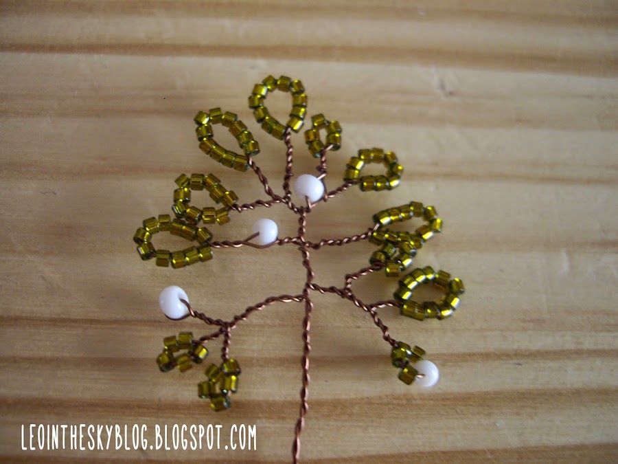 Una vez introducidos los abalorios, se forma un arito, se retuercen los extremos del hilo y ya tenemos la primera hojita de nuestro árbol. El resto de hojas se hacen de la misma forma, combinando hojas más grandes con otras más pequeñas hasta que quedemos satisfechas con el resultado.