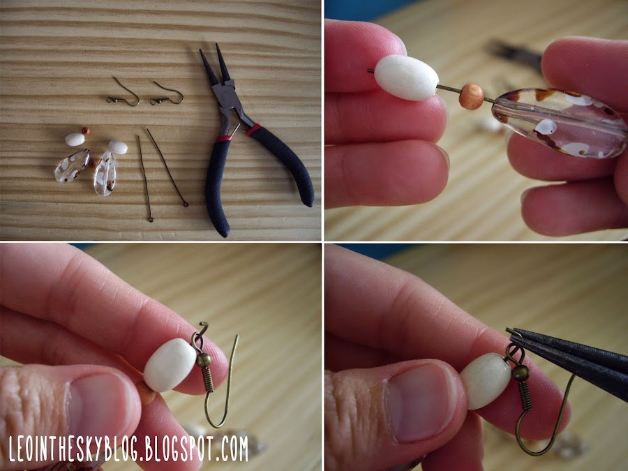 El paso a paso es muy fácil, como veis en las fotos, sólo hay que introducir los abalorios en los bastoncillos, meter la pieza que sirve para colgarlos y cerrar el bastoncillo con la ayuda de unos alicates de puntas redondas, formando un arito.