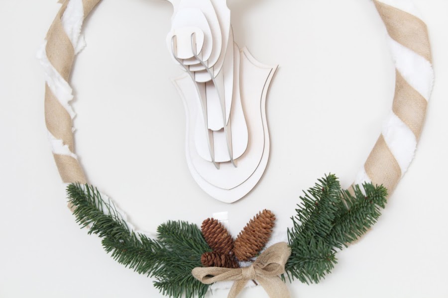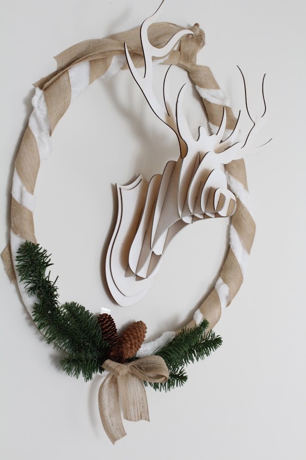 Para esta corona he usado una circunferencia que he forrado con tela de pelito y decorado con elementos naturales para enmarcar a nuestro Rudolf.