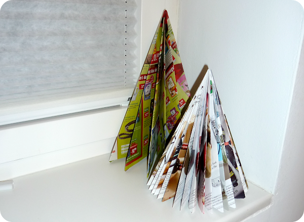 Hay un montón de opciones para elaborar pequeños arbolitos de navidad: con fieltro, lana, cartulinas, hilo... A cada cual más bonito. Pero como os he dicho, esta vez vamos a simplificar aun más en los materiales y os propongo hacer arbolitos con papel de revista. Porque... Quién no tiene revistas de publicidad por casa?