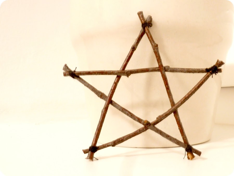 Esta idea si que no tengo ni idea dónde la vi o la encontré. Y aunque he mirado por youtube no he visto ningún tutorial o no he sabido buscar uno en el que hagan una estrella tal cual como esta. Así que os hago un breve resumen de lo que hay que hacer. Los materiales como veis son solo ramitas (que podéis coger de cuando podan los árboles por ejemplo) e hilo. Hay que cortar 5 trocitos del mismo tamaño e ir uniéndolos unos con otros, con el hilo, por los extremos (como se ve en la foto), siguiendo la forma de una típica estrella de cinco puntas. y no tiene más!! sólo eso jeje. Fácil verdad?