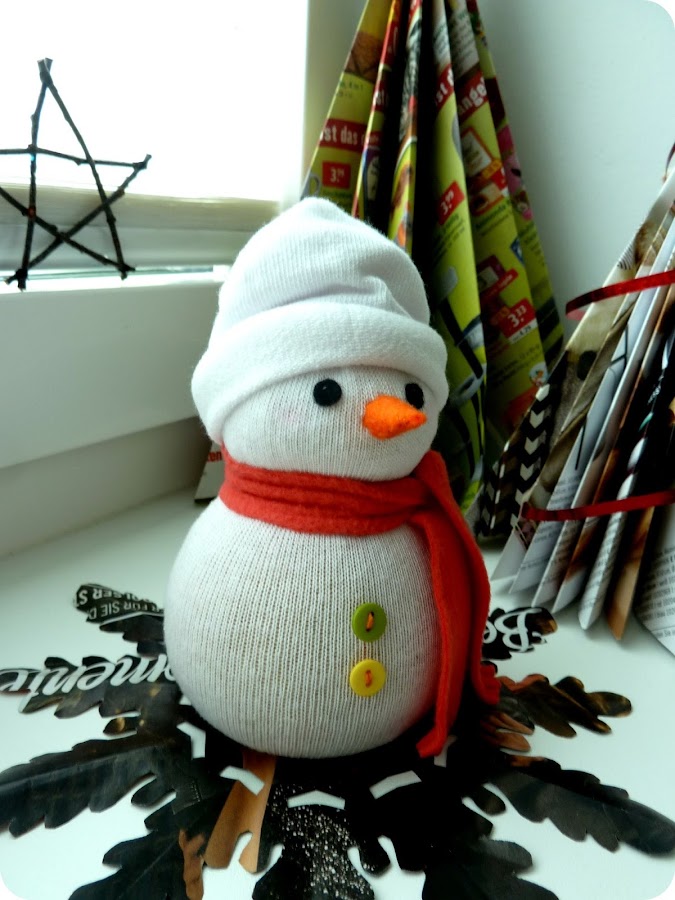 Es cierto que esta navidad no está siendo muy blanca (y eso que ando por tierras alemanas!) pero... y lo bonitos que quedan en cualquier decoración navideña (o simplemente invernal, porque este vale también para cuando acabe la navidad ;) ) unos simpáticos muñecos de nieve. Pues para hacer uno como este, basta con que tengas unos calcetines blancos, arroz, un poco de hijo y para la carita cualquier material es bueno, desde rotuladores, a alfileres, botones, trocitos de fieltro, o incluso recortes de revista. Repito, lo que tengáis por casa!