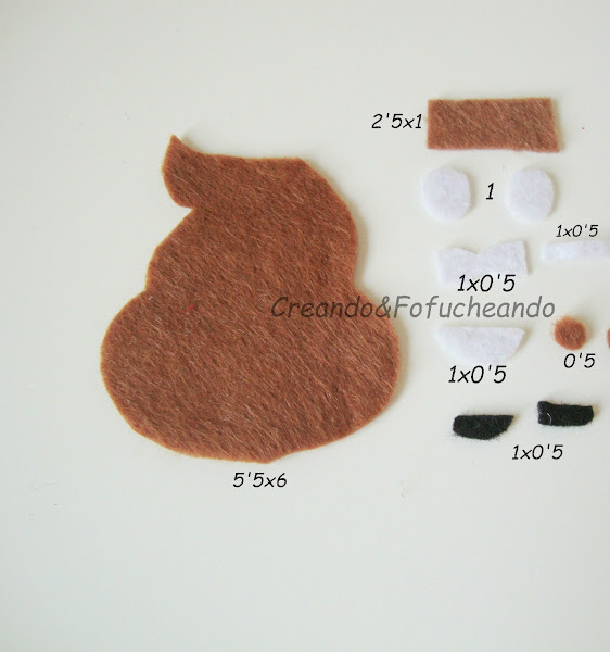 Le vamos a hacer unos ojos como adormilaíllos. Para ello necesitamos piezas de Fieltro marrón así en semicírculo,que coseremos sobre los ojos blancos.