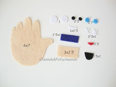 Una vez pasada al Fieltro la manita en tono color carne,vamos cosiendo las piezas con los hilos de los mismos colores que éstas.
