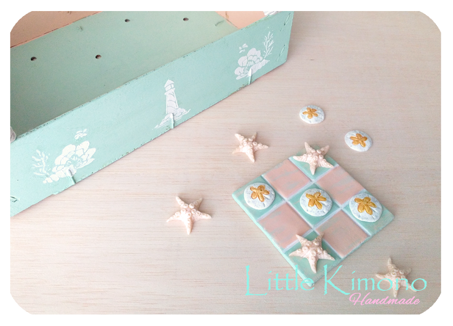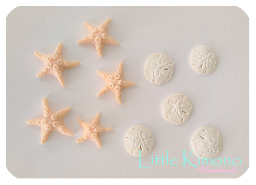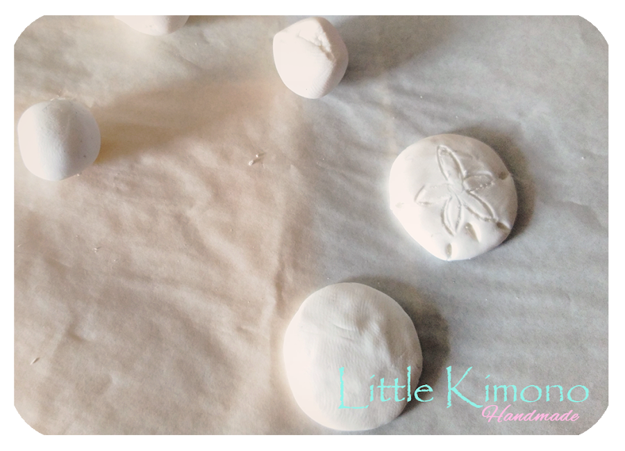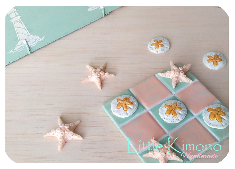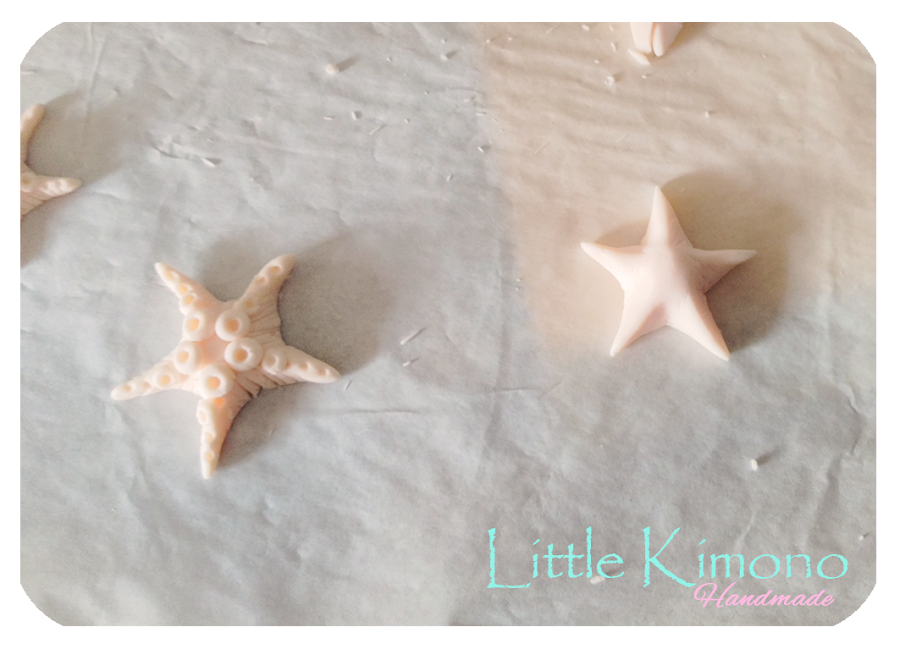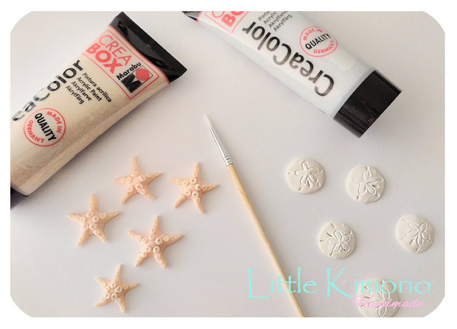 3. Tercer paso: Hacemos las figuras de nuestro 3 en raya con la pasta de modelar (5 de cada) yo elegí estrellas de mar y "dolares de arena". Dejamos secar si es de secado al aire libre u horneamos si es pasta de secado al horno.