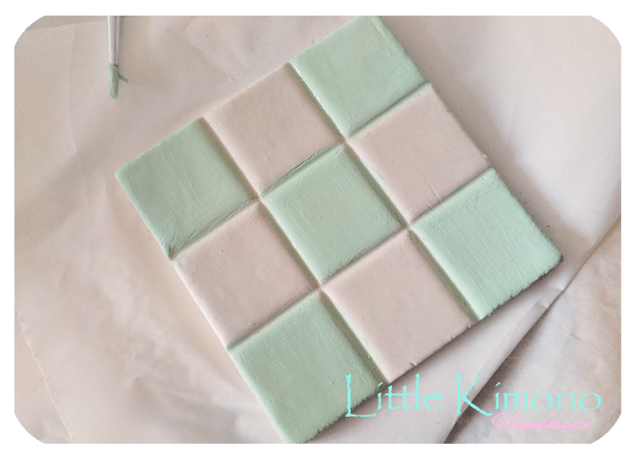 2. Segundo paso: Después de marcar los cuadrados de 3x3cm procedemos a pintar, en este caso con tonalidades acorde a un estilo costero. Para dar un aspecto desgastado, podemos dar unas pinceladas (con el pincel casi seco) con pintura contraria al color que teníamos en el cuadro ya pintado, como muestro en la foto ;)