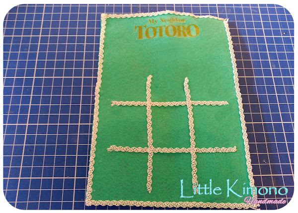 6. El tablero, podemos usar cualquier material, yo usé el fieltro (para poder doblarlo al guardarlo) y cinta para las divisiones con un transfer arriba que pone "Mi vecino Totoro"^^