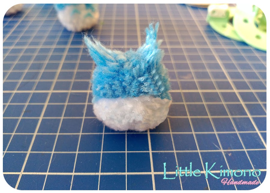 4. Para el segundo personaje, el mío era de dos colores, así que rellenamos un lado de la pomponera de un color y el otro lado de otro color. Podemos hacer alguna prueba antes para ver la distribución correcta de la lana ;) Igualmente recortamos e igualamos, para hacer las orejas dejé una hebras más largas a los lados.