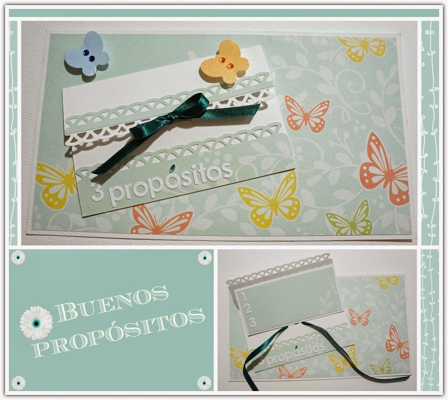 Creo que el papel es muy bonito y llena totalmente la tarjeta, por eso me centre en el sobre, que contiene un tag dónde escribir tres propósitos (para poder cumplirlos y porque se adaptaban muy bien). Está hecho con cartulina blanca y decorado con el mismo papel de la tarjeta, troquelando algunas partes para darle más protagonismo.